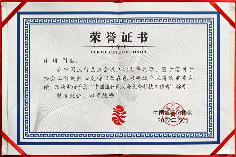 在2022年12月30日中国流行色协会成立40周年庆典活动中,我院贾琦教授因在中国流行色协会多年的突出表现及为色彩教育事业做出的突出贡献和在色彩领域中取得的重要成绩,被授予“优秀科技工作者”称号。