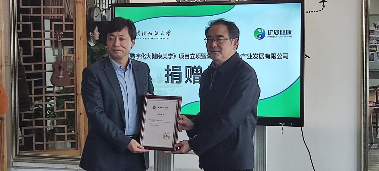武汉纺织大学校党委书记田辉玉为代表对湖北护您健康产业发展有限公司颁发捐赠证书