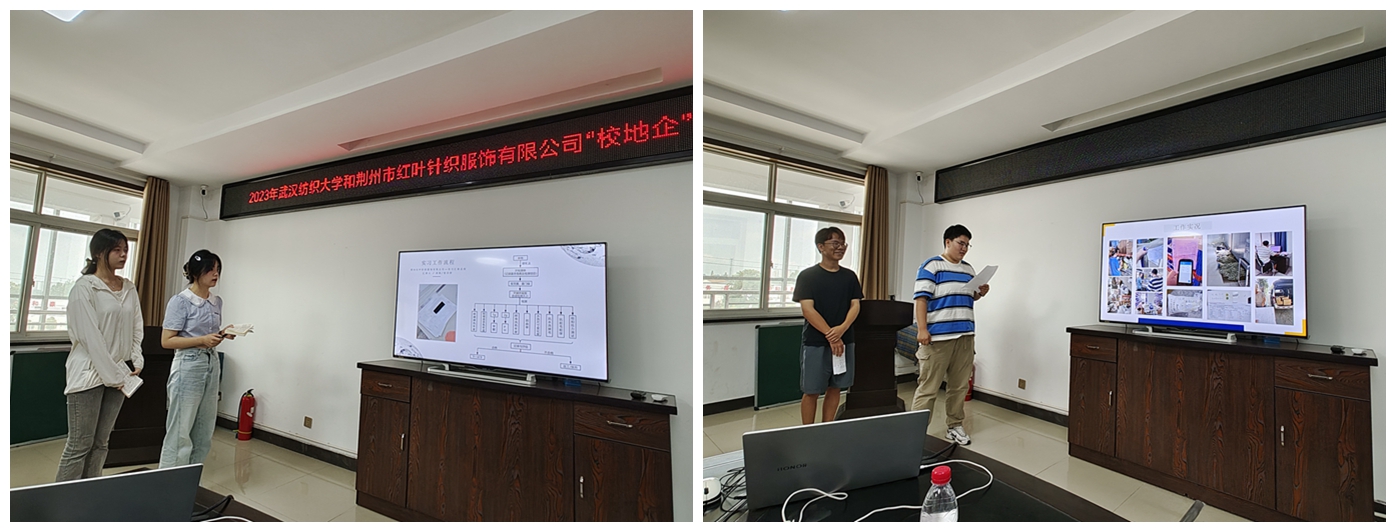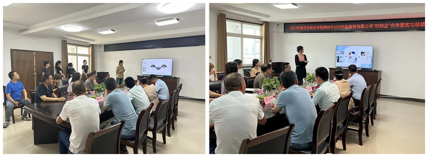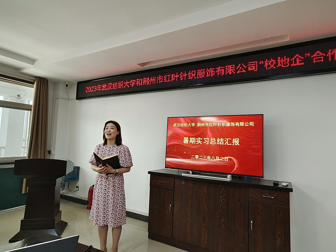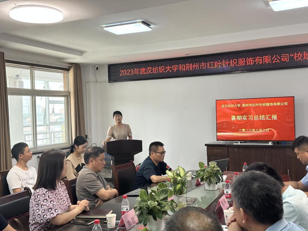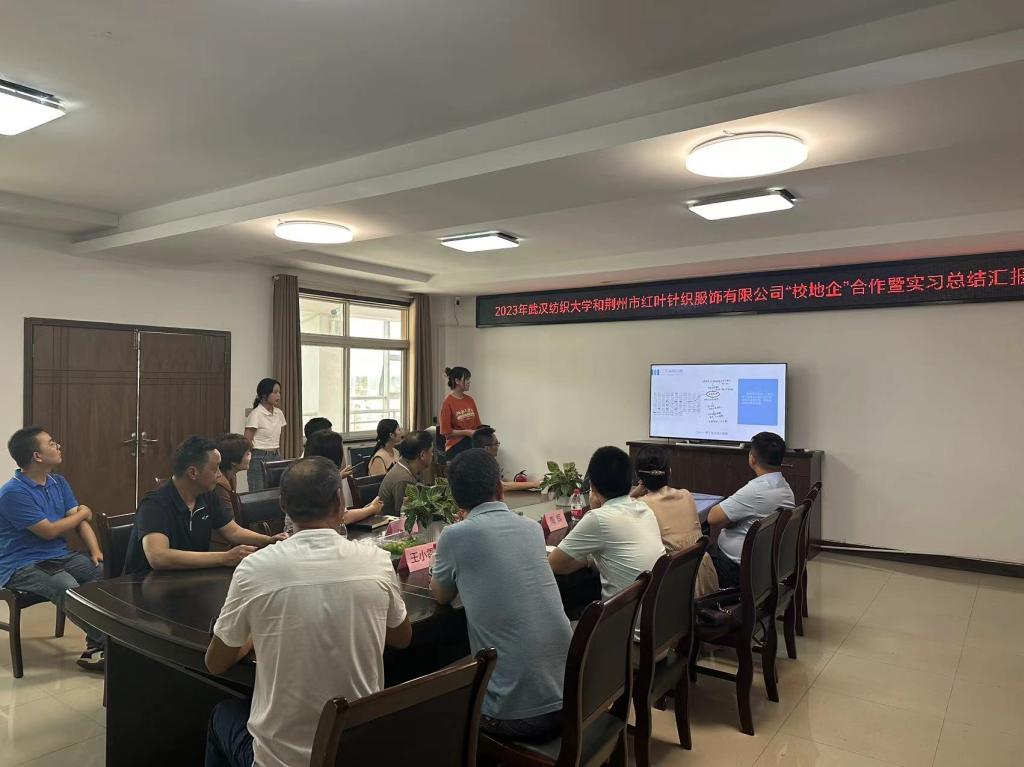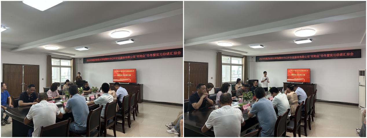 与荆州市红叶针织服饰公司共同组织的暑期实习项目总结汇报会在荆州红叶会议室举行。岑河镇党委委员、副镇长李鲲,红叶公司总经理孟祥贵、业务系统经理龙丽、生产系统副总经理王兴华、生产系统总经理助理徐国强、设计部吕晓梅、生产系统人事经理刘诗才,中国体育博彩