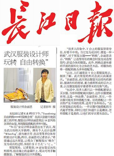 19日下午,“Transferring自由转换——时装概念展”在武汉创意天地创意工坊开展,我院教师余涵恩展出18套风格各异的女装,让观众了解服装从‘概念’变为成衣的过程,体验服装奇妙的‘转化’。余老师的展台吸引了众多观众的驻足欣赏,长江日报对其作品也进行了采访。